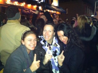 strangers high fiving, hugging,